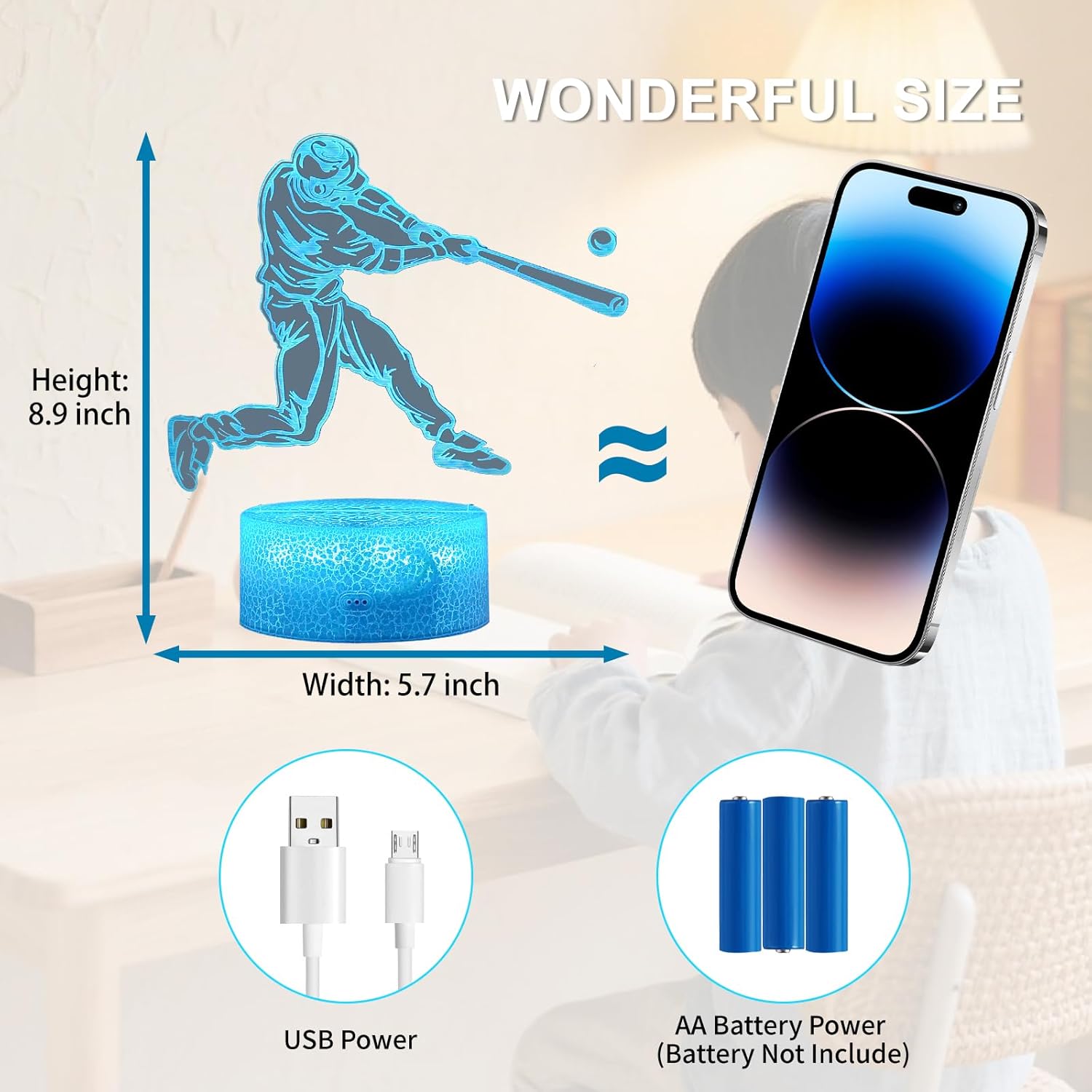 Two power options for convenience. The 3D baseball night light can be powered via USB (cable included) or with 3 AA batteries (batteries not included). This flexibility makes it easy to enjoy at home, in a bedroom, or on the go, with energy-saving LED performance.