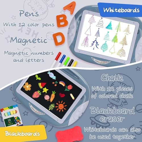 On the whiteboard side, little ones can arrange 26 magnetic letters and 25 magnetic numbers to spell simple words and practice counting. The included 5 colored pens give kids colorful ways to write and draw. In addition, kid-friendly templates for addition, subtraction, multiplication, and division provide gentle math practice in a playful format. This setup helps with literacy, numeracy, fine motor skills, and visual recognition—all in one compact easel.