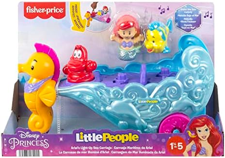 What’s included and how it works: The playset comes with a push-along carriage plus Ariel and Flounder figures. A Sebastian-triggered feature lights the carriage and delivers entertaining sounds and music when pressed, bringing the scene to life. The carriage can hold up to three Little People figures, so kids can invite friends on the adventure. Additional toys are sold separately and subject to availability.