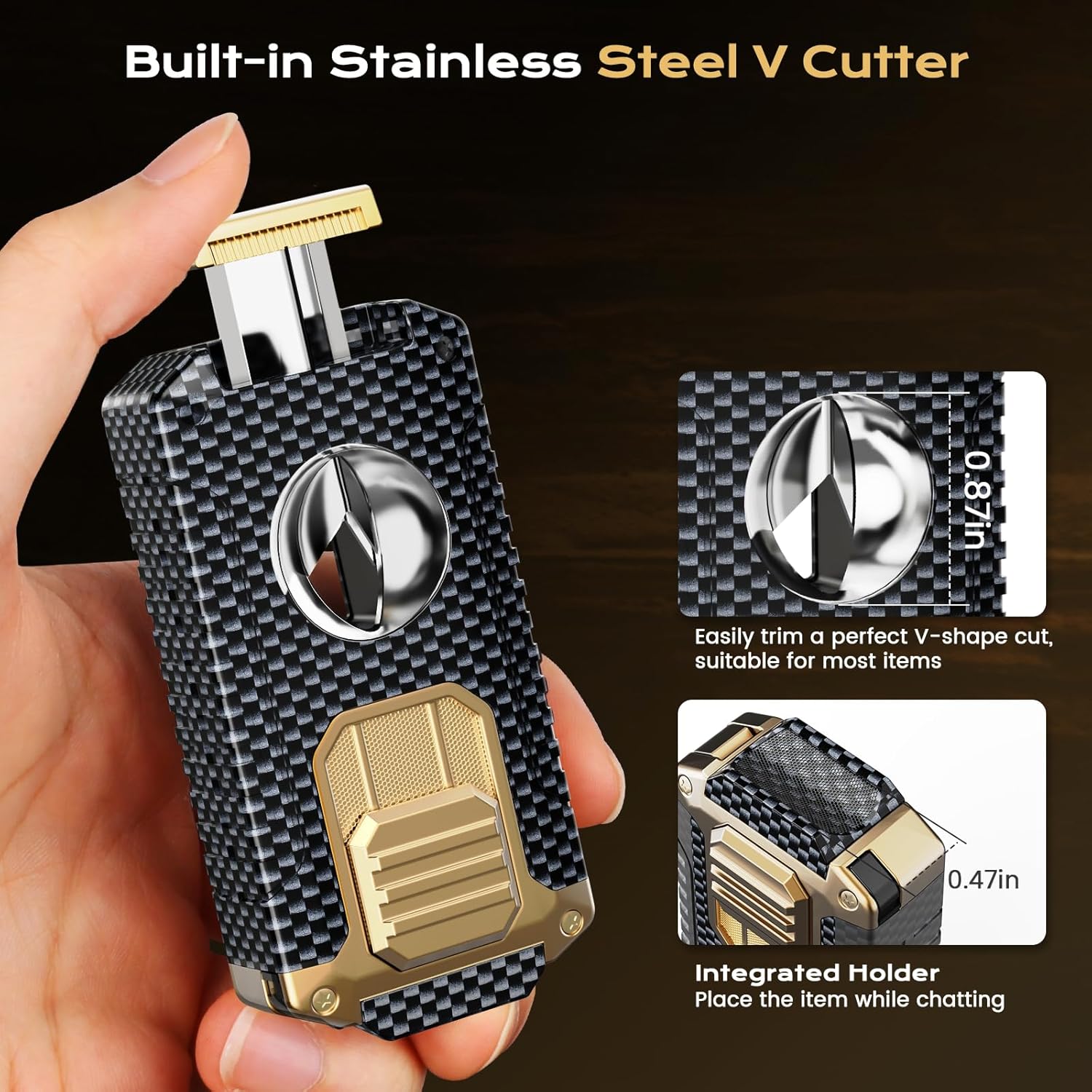 Five powerful tools in one lightweight package. This windproof torch lighter features three robust burners for steady ignition even in breezy conditions. It also includes a built-in stainless steel cutter for clean, precise cuts, a punch for creating small holes, and a hidden draw enhancer plus a convenient holder. The carbon fiber black finish adds a touch of style while maintaining durability, so it’s ready for use at home, at the club, or on the trail.