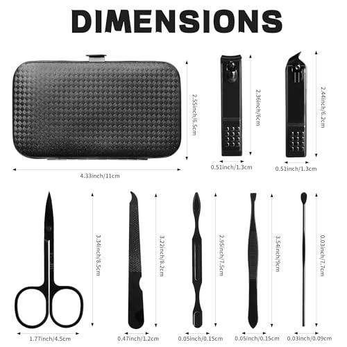 Specs at a glance – 7 tools in one: nail clippers (flat and diagonal), eyebrow scissors, eyebrow tweezers, nail file, nail cleaner, ear pick – Material: stainless steel with a PU leather case – Case size: 4.3 x 2.8 x 0.7 inches; weight: ~0.2 lbs – Gift-ready packaging with a stylish, timeless look