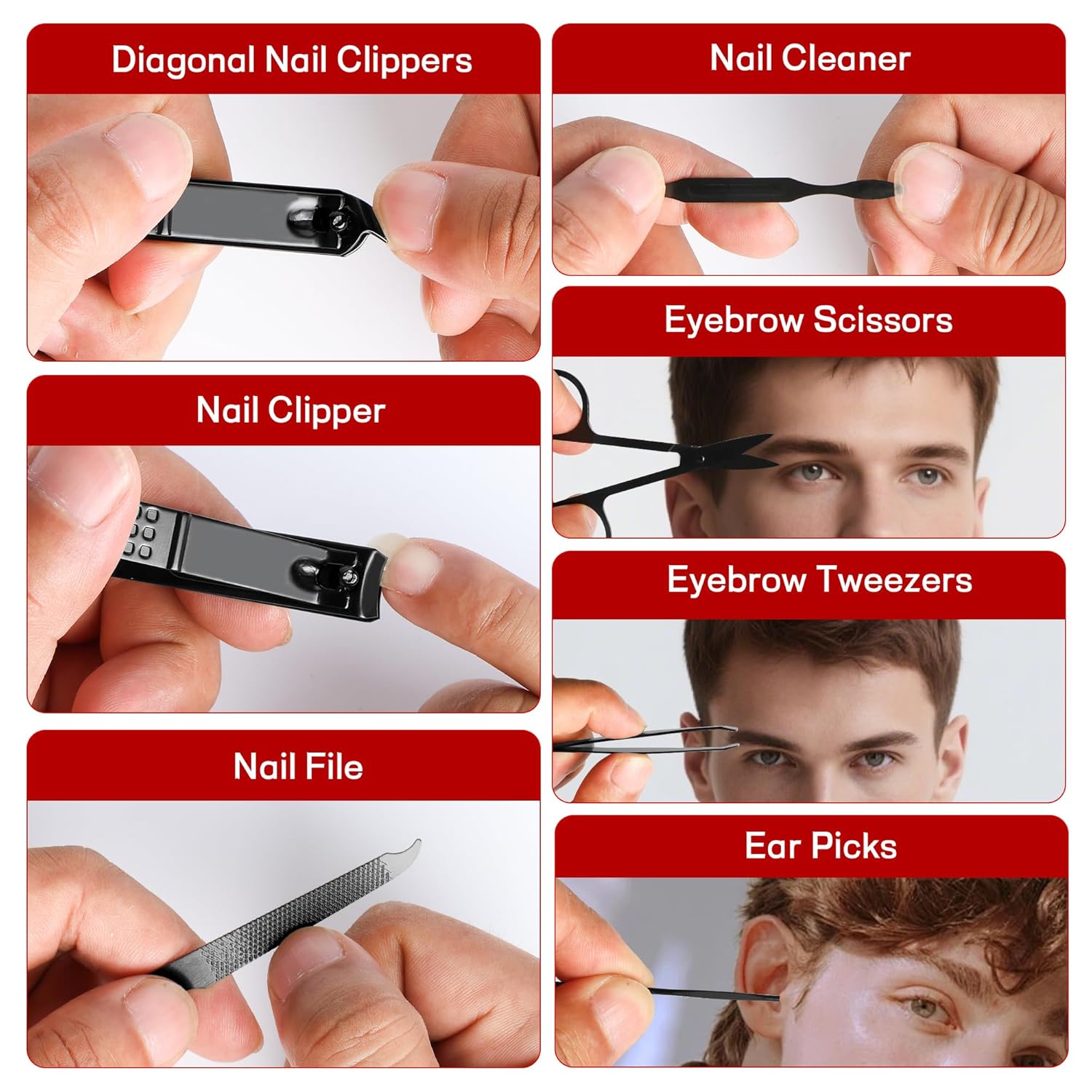 What’s included – 1x Flat Nail Clipper – 1x Diagonal Nail Clipper – 1x Eyebrow Scissors – 1x Eyebrow Tweezers – 1x Nail File – 1x Nail Cleaner – 1x Ear Pick All of these items fit neatly into a portable black PU leather case with a red lining, and the box itself is gift-ready for easy gifting.