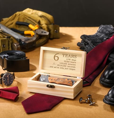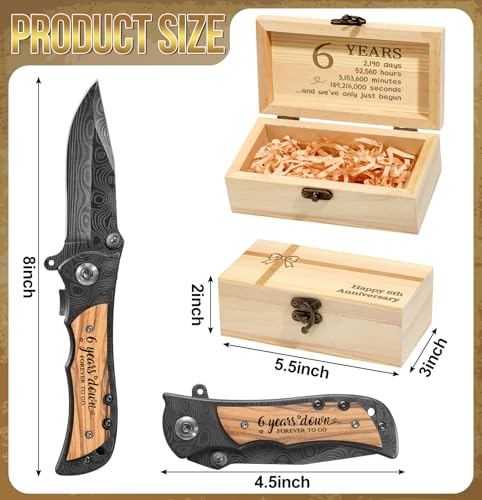 Summary of what you’ll get: – Lockable wooden gift box with raffia padding – Olive wood handle folding knife with a Damascus-style blade – Engraved handle: “6 YEARS DOWN, FOREVER TO GO” – Ready-to-gift packaging with compact, pocket-friendly dimensions