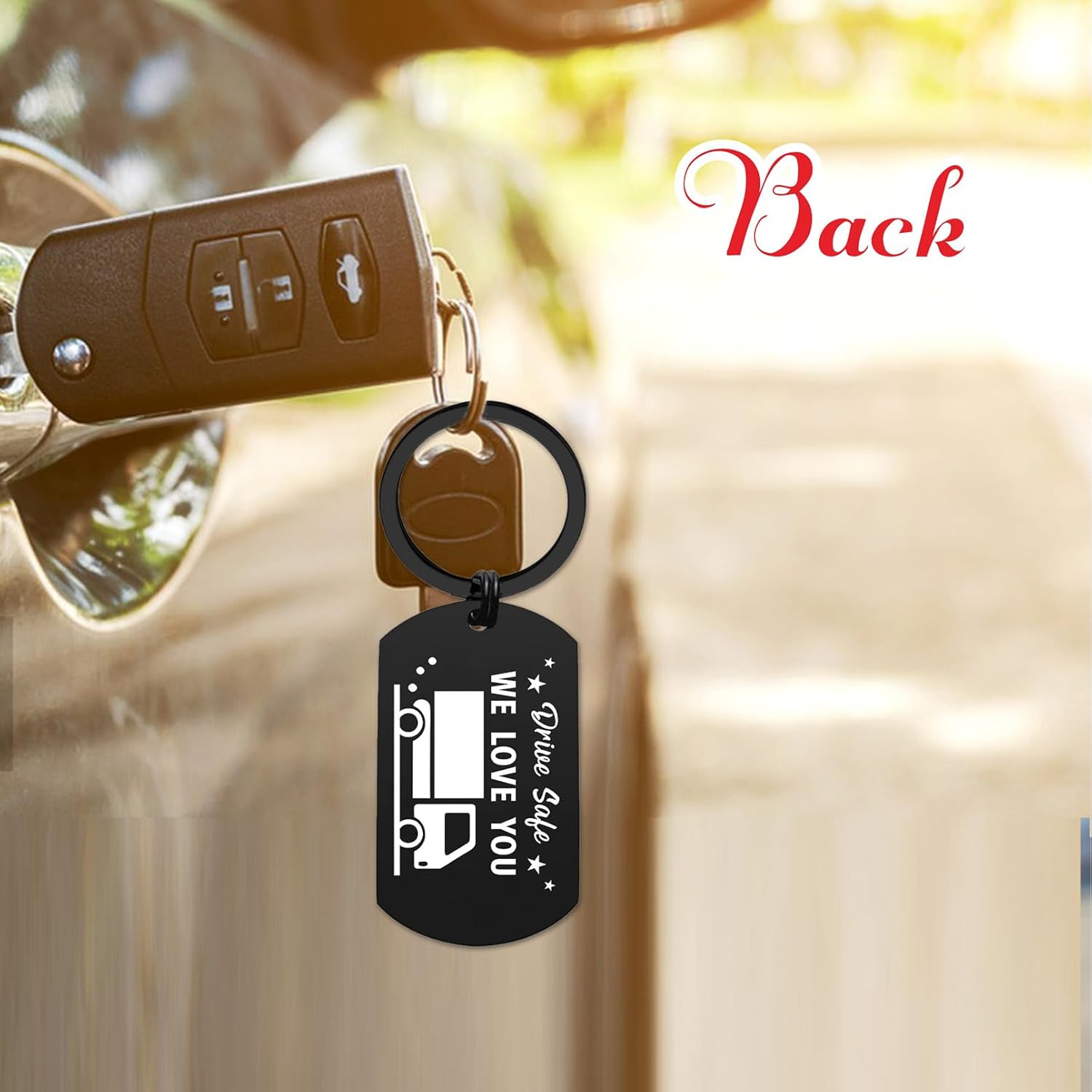 The pendant measures about 1.1 by 2 inches, with a 1.2-inch ring. It fits easily on truck keys, house keys, a bag, or even a jacket zipper pull, so your loved one can carry it wherever the road takes them.