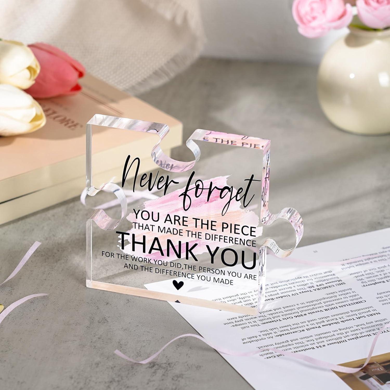 - Product Details: This acrylic puzzle-shaped plaque measures 3.9″ x 4.7″ x 0.6″, featuring a soft pink hue. It comes with an elegant gift box, making it a thoughtful and ready-to-gift item