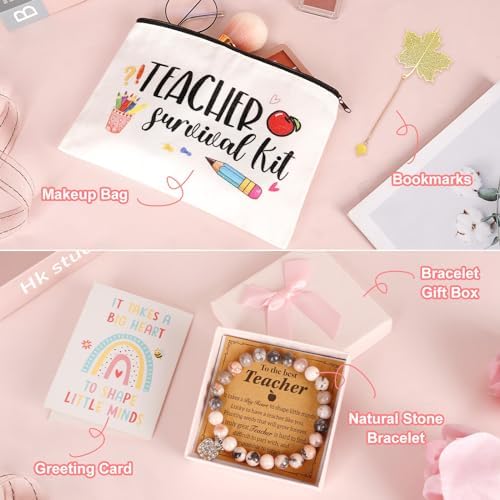 - 【Teacher Appreciation Gifts Set Includes】-1*20 oz Teacher Tumbler/Mug (It Takes A Big Heart To Shape Little Minds),Comes With Straw And Straw Cleaner,1 pair of Socks(If You Can Read This,This Teacher Is Off Duty),1*Metal Teacher Bookmarks With Chain,1*Natural Stone Stretch Bracelets,1*Teacher Pouch Bag(Teacher Survival Kit),1*Greeting Card (Best wishs),1* Beautiful Gift Box,Best Christmas Gift for Teachers