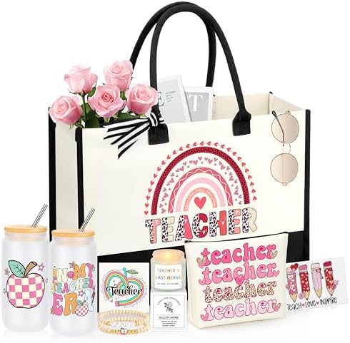 - 【Thank You Gifts Set for Teacher Includes】5 items in this gifts set have been handpicked by us which includes 1 stylish tote bag, 1 practical canvas makeup bag, 1 16 Oz glass cup with lid and straw, 1 special wood bead bracelet, and 1 greeting card with heartwarming words, Show your appreciation to the best teacher with this gift set.